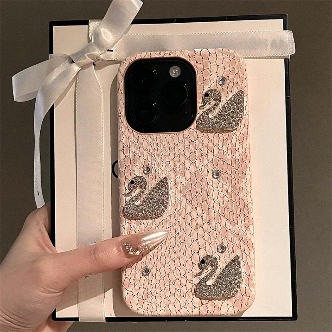 Turn heads with a shimmering case adorned by graceful swan motifs. Designed to protect your phone without compromising style, it molds seamlessly to iPhone models from 11 through 16. A glimmering surface and sparkling accents offer an instant dose of luxury in every swipe and scroll.