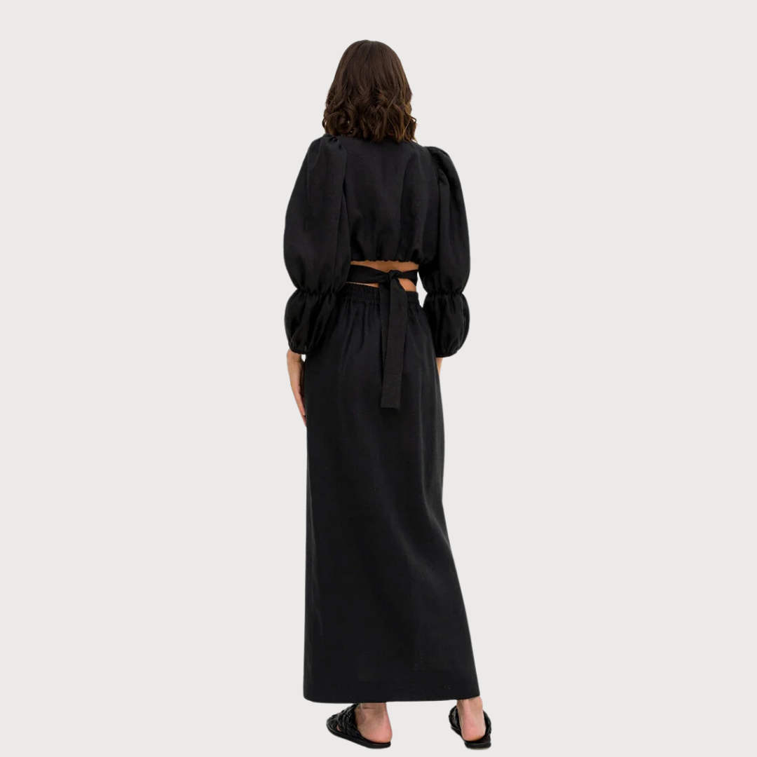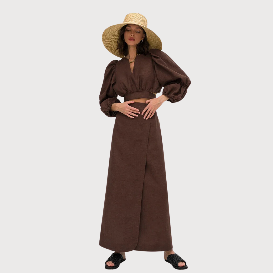 Morphing from runway drama to timeless treasure, this two-piece masterpiece, crafted from a whisper-soft cotton-linen blend that flatters every form, detaches at the sleeves to reveal a clean silhouette, all while exuding quiet confidence from the boardroom to the soiree.