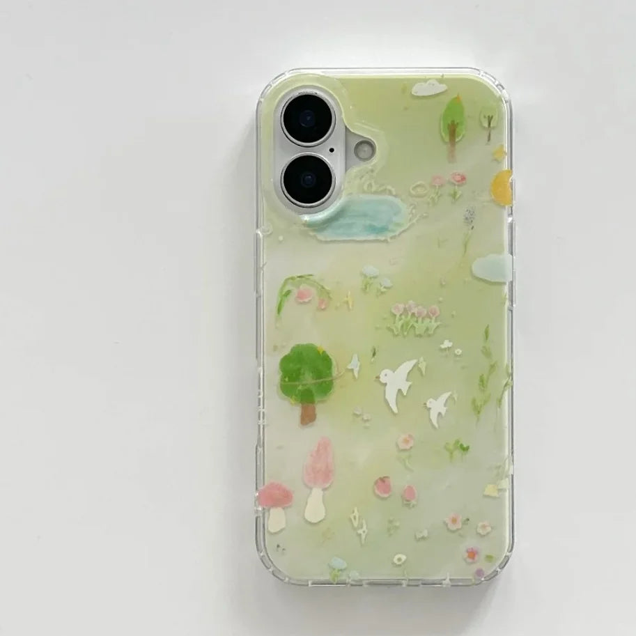 A matte shell carries a soft-focus spring landscape inspired by Seoul’s gallery district. The print is laid under a scratch-clear topcoat, preserving brush-stroke textures and muted pastels. An impact-cushion frame blends seamlessly into the artwork, while a slim bezel lifts screens and lenses clear of surfaces.
