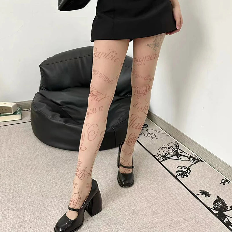 These ultra-soft, English-printed stockings transform an ordinary outfit into a fearless style statement. The intricate lettering creates a subtle tattoo-inspired effect, blending punk and elegance into a look that demands attention from every angle.
