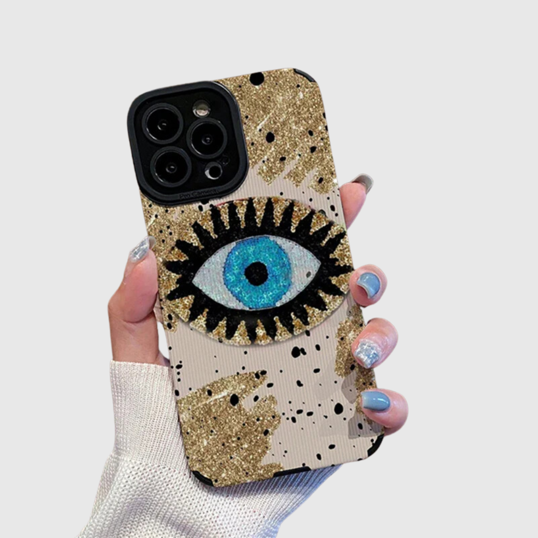 Beguile the world with the Visionary Glance phone case - a vibrant eye on a glittering gold shield for your tech.