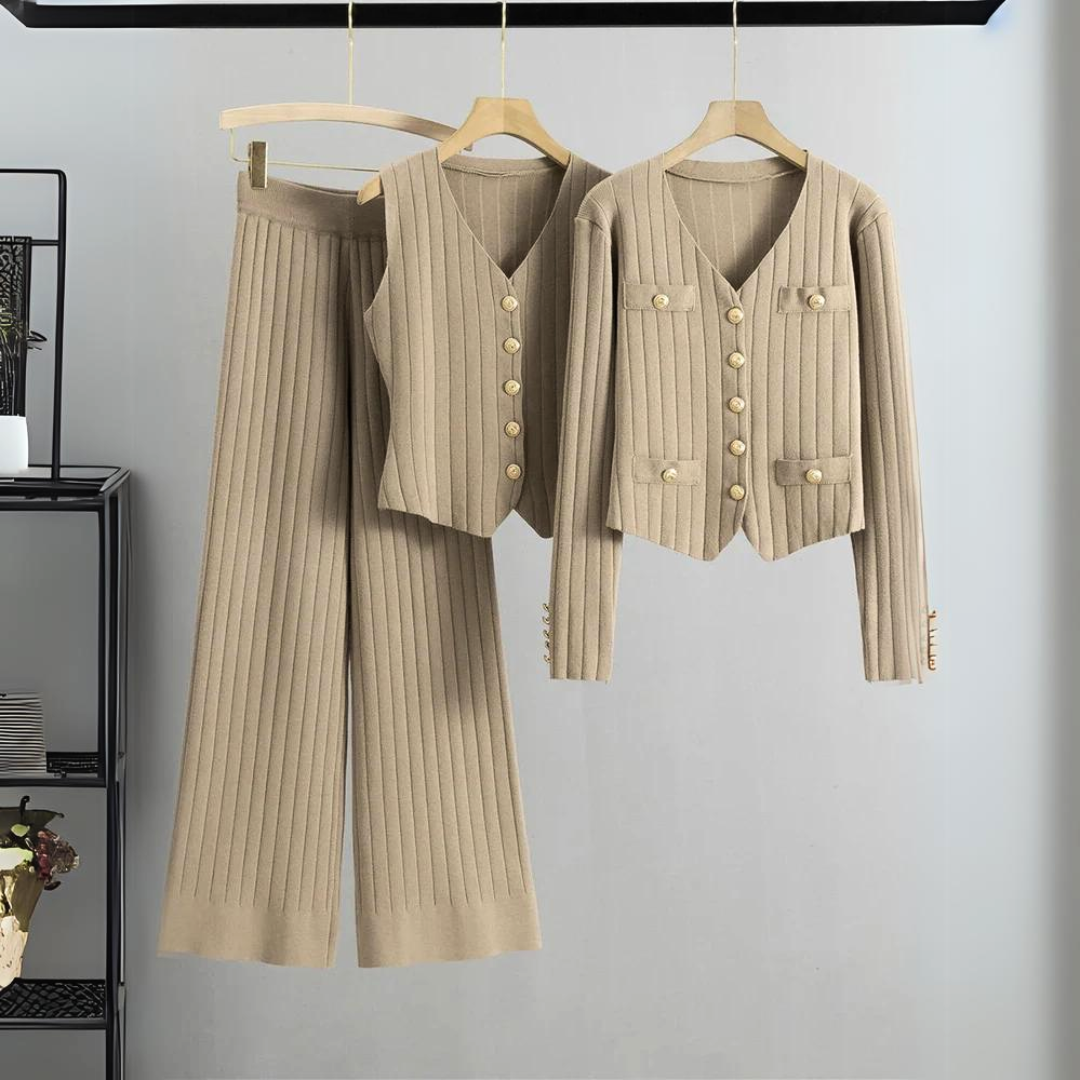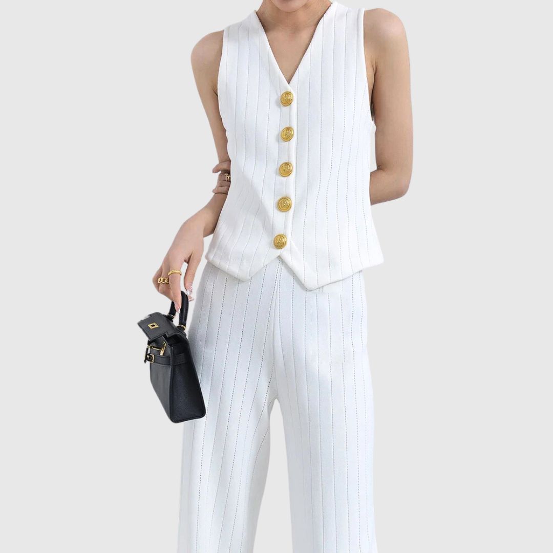 Each set includes a simple top and matching pants, available in basic white, beige, and black. The tops feature durable gold-toned buttons and come in various sleeve lengths to suit different preferences. Our wide-leg pants are designed for comfort and easy movement throughout your day.