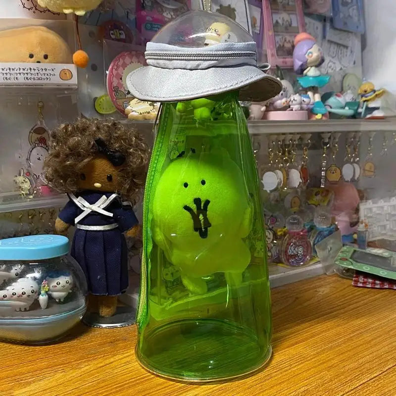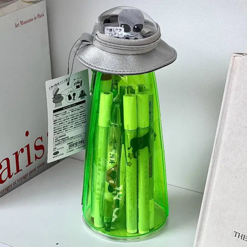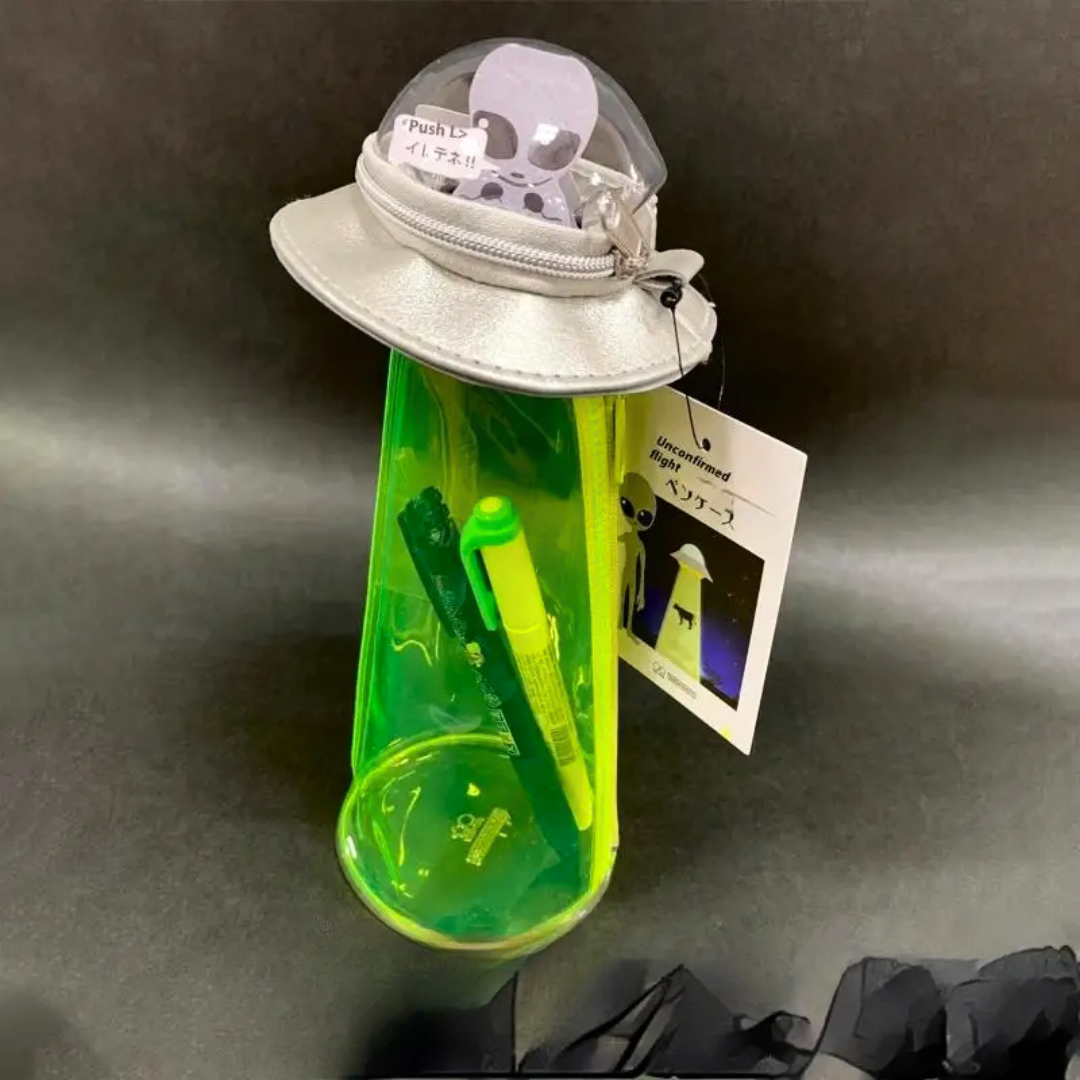 Shaped like a classic flying saucer, this translucent green case stands upright on your desk and opens wide under the removable dome lid. The roomy interior fits pens, markers and small tools; light enough to toss in a backpack.