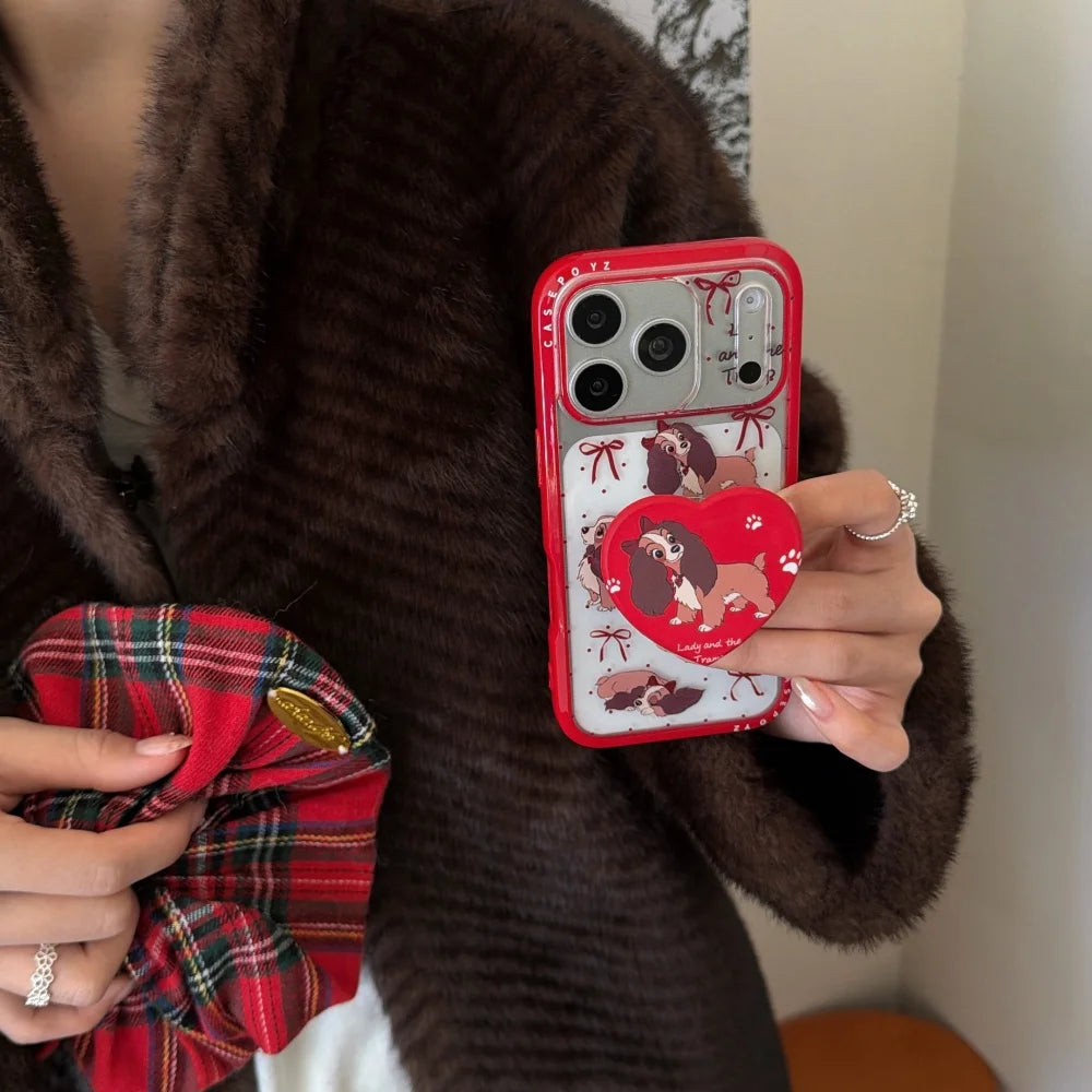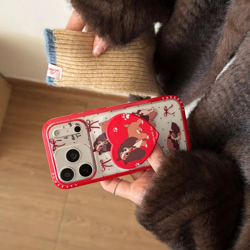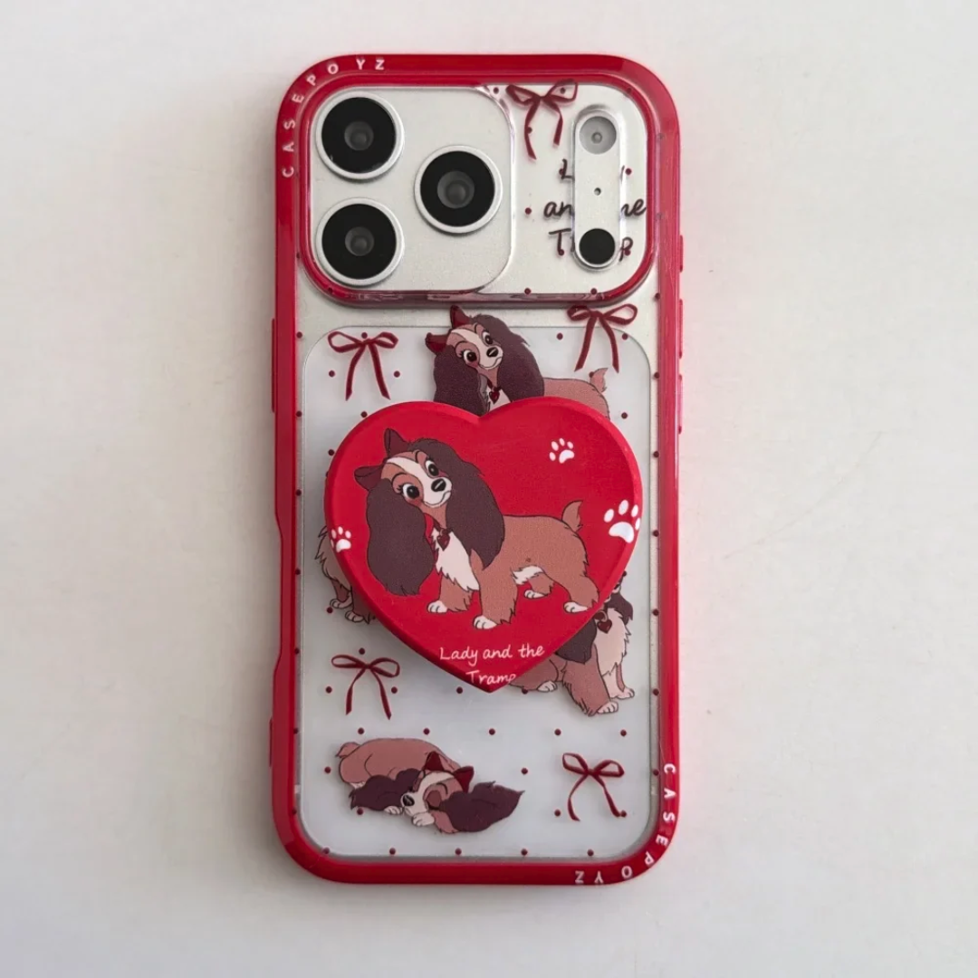 Storybook puppies, bows, and bright red trim turn this case into a playful little keepsake with a holiday-sweet mood. A matching heart grip steadies the hold while raised lips and a shock-ready shell help protect screens and lenses from coffee runs to late-night texts.