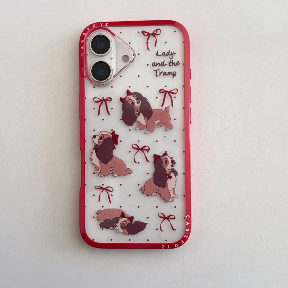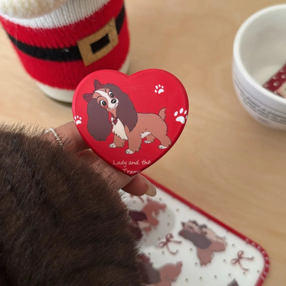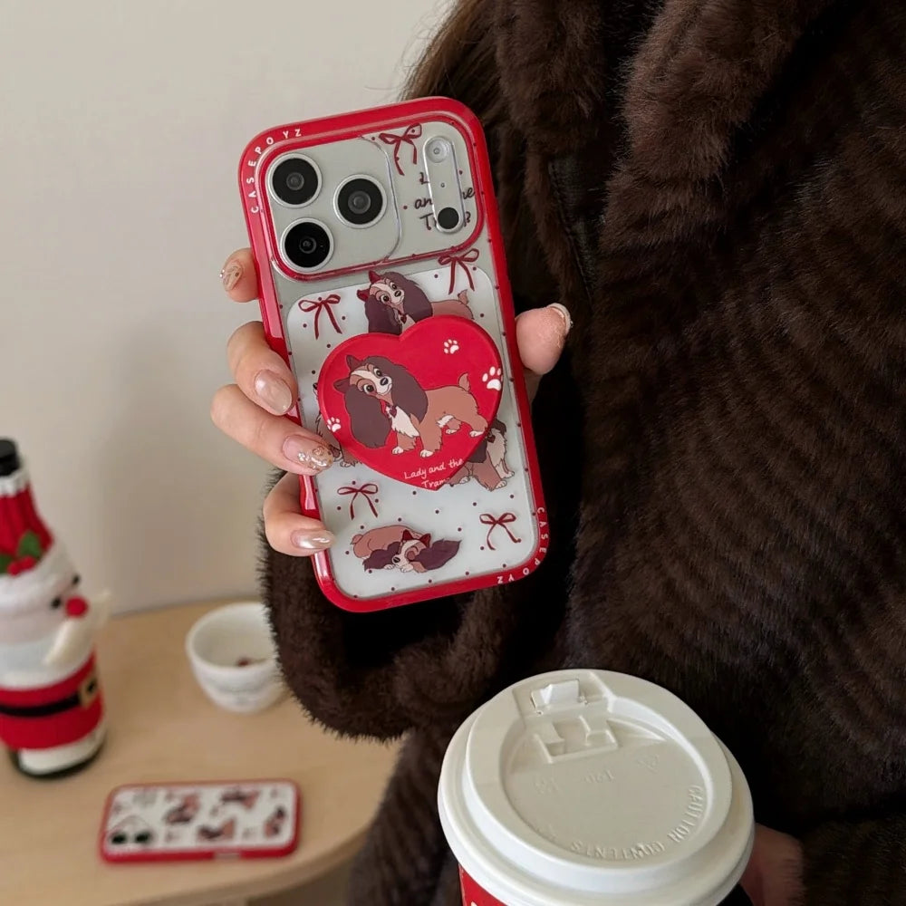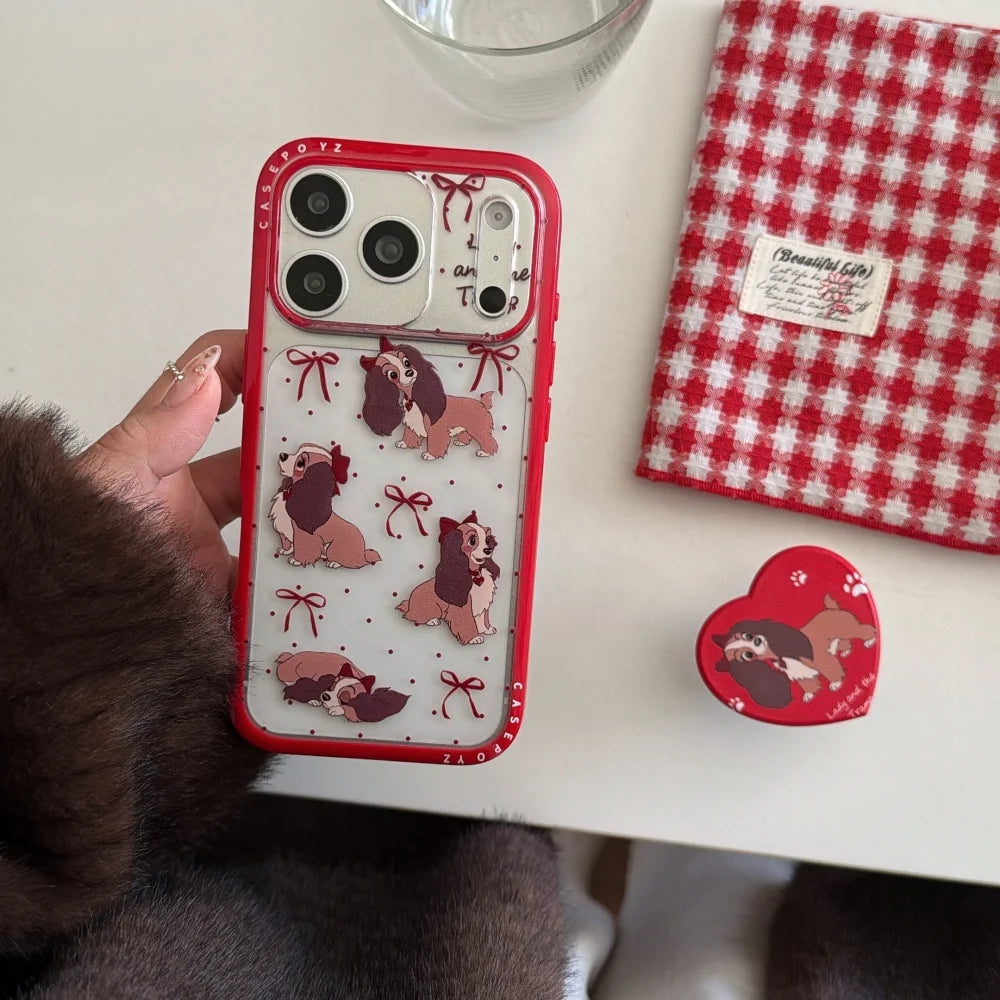 Storybook puppies, bows, and bright red trim turn this case into a playful little keepsake with a holiday-sweet mood. A matching heart grip steadies the hold while raised lips and a shock-ready shell help protect screens and lenses from coffee runs to late-night texts.