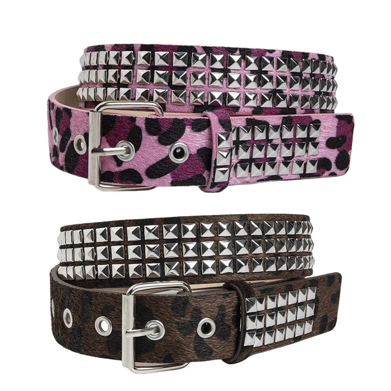 Wild Stud wraps plush leopard‑print faux fur around a double row of polished pyramid studs, finishing with a square pin buckle for instant punk‑meets‑Y2K attitude. The PU strap stays flexible yet durable, cinching jeans or dresses with a flash of rebel sparkle.