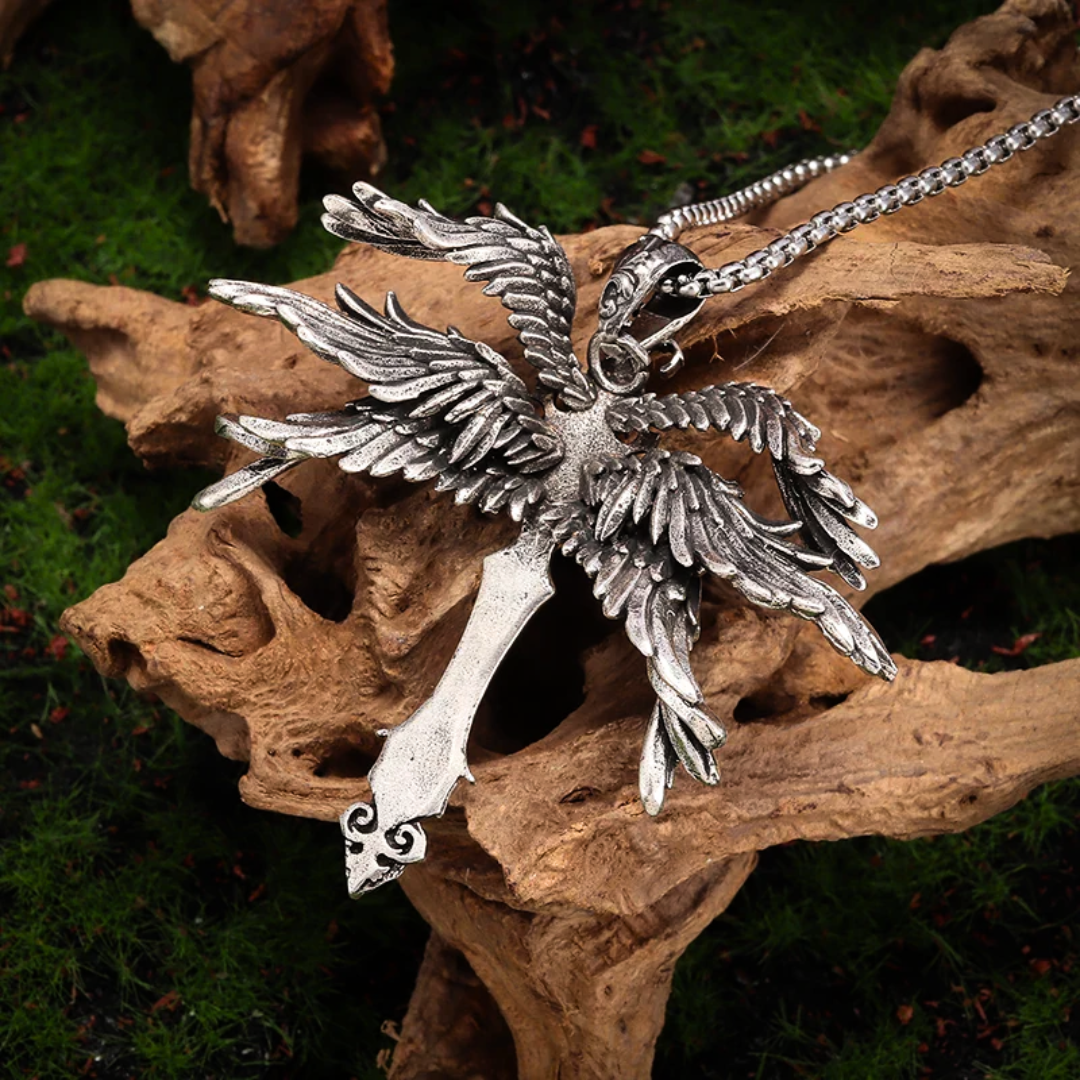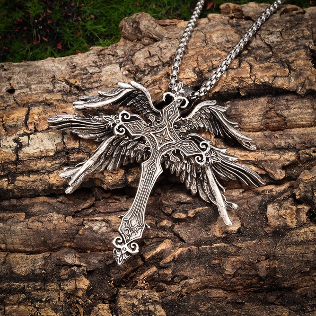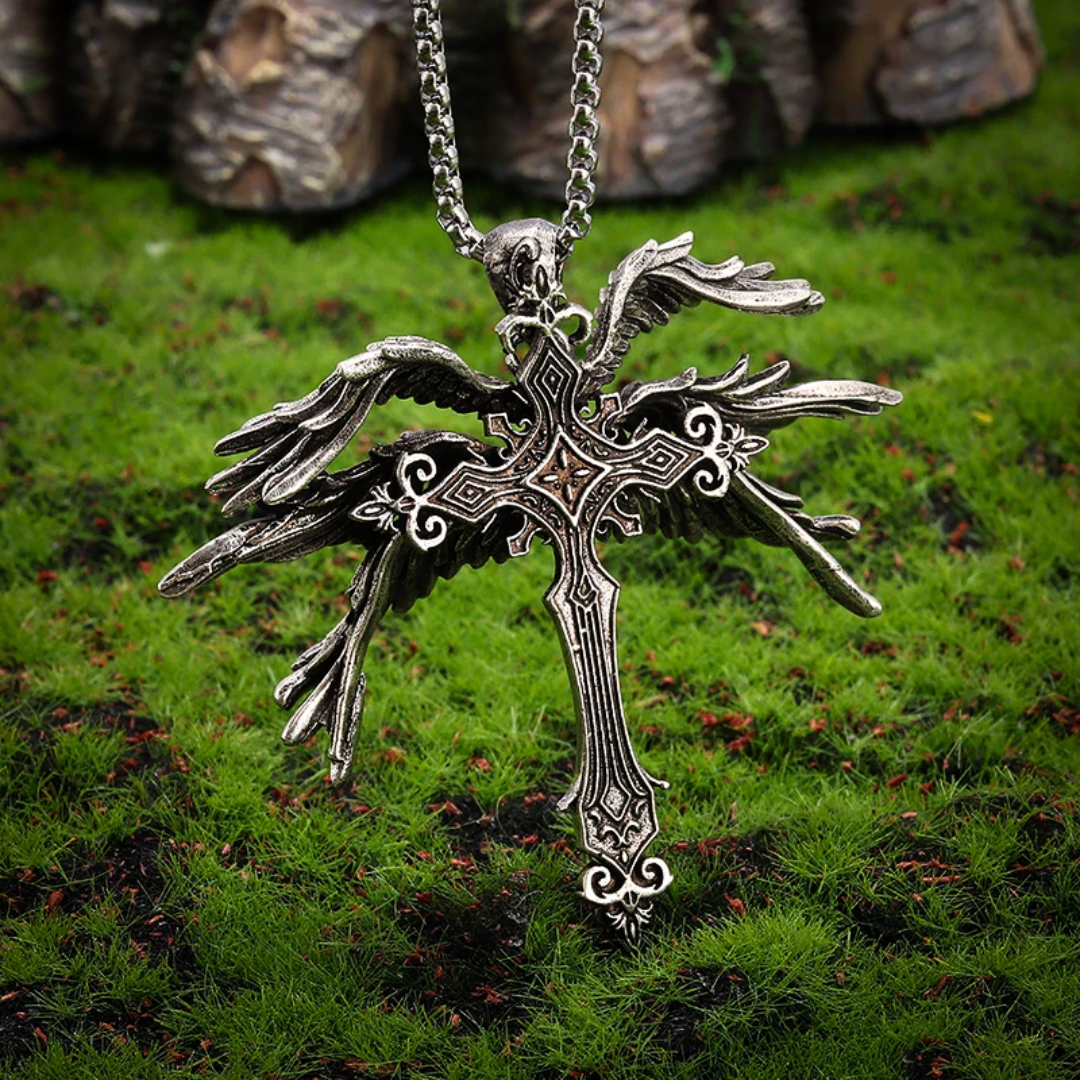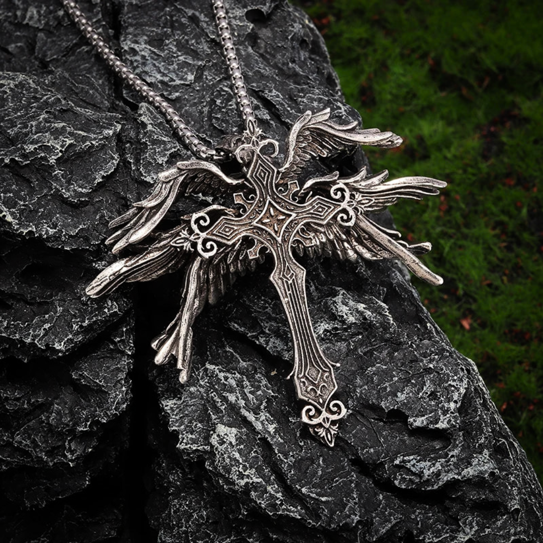 This striking piece merges angelic symbolism with a gothic edge, creating a bold statement that's both rebellious and spiritual. Crafted from silver-toned metal, the detailed wings and ornate cross capture a vintage aesthetic that's perfect for adding a touch of mystique to any outfit.