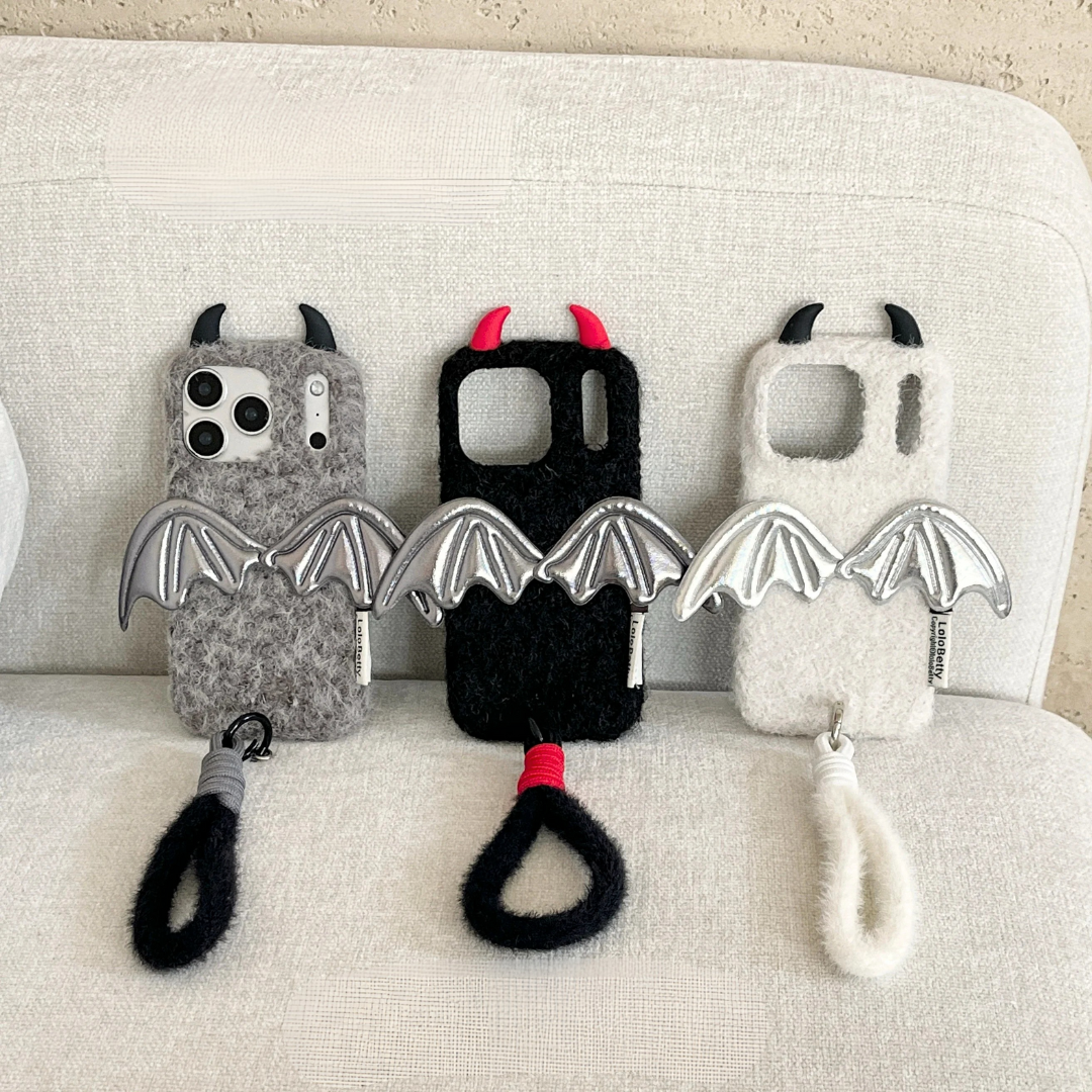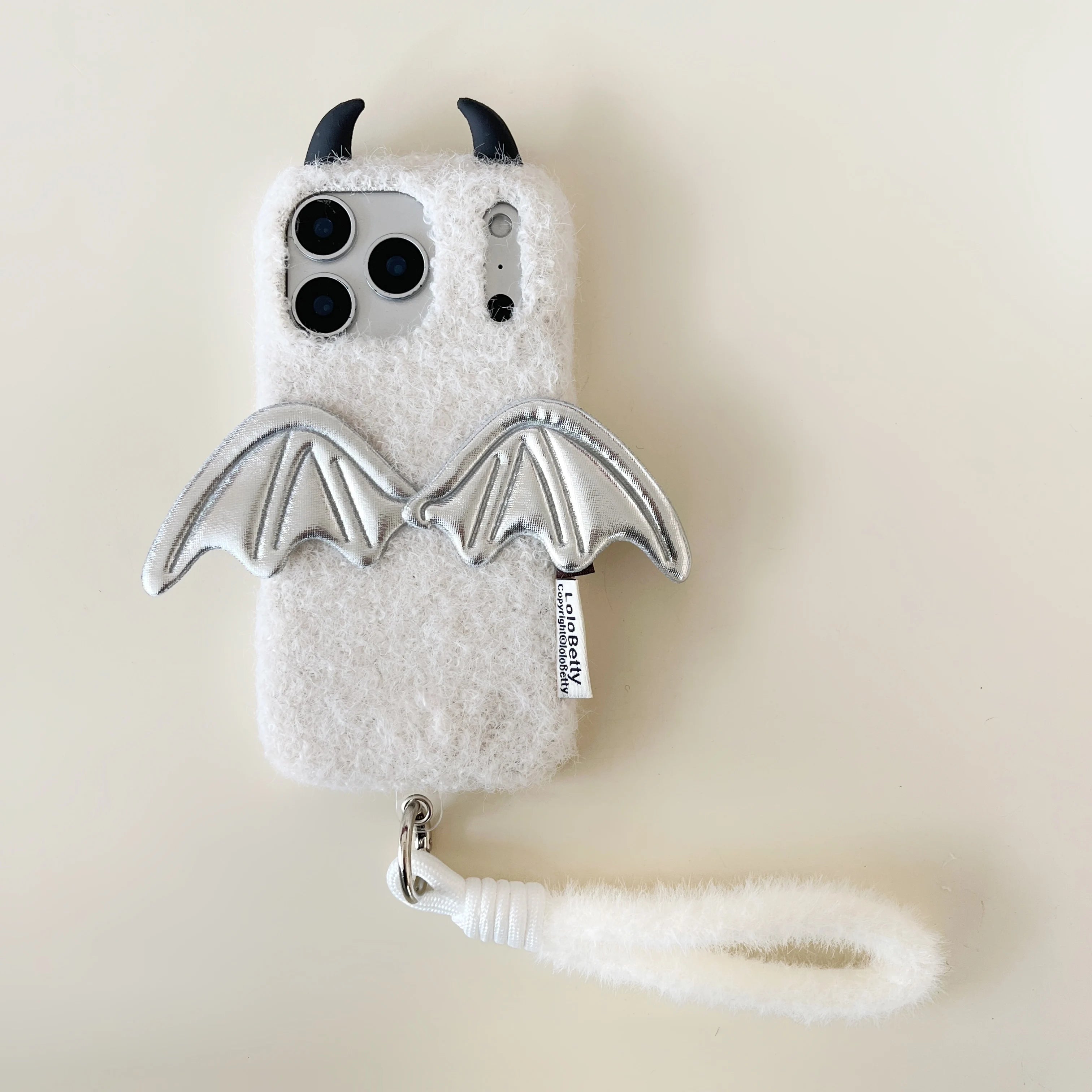 Soft, fuzzy fabric wraps your phone in a cozy layer, finished with silver bat wings and tiny devil horns that pop off the back like a costume. A matching plush wrist loop hangs from the bottom, so it swings when you walk and makes mirror selfies look instantly more “main character.”