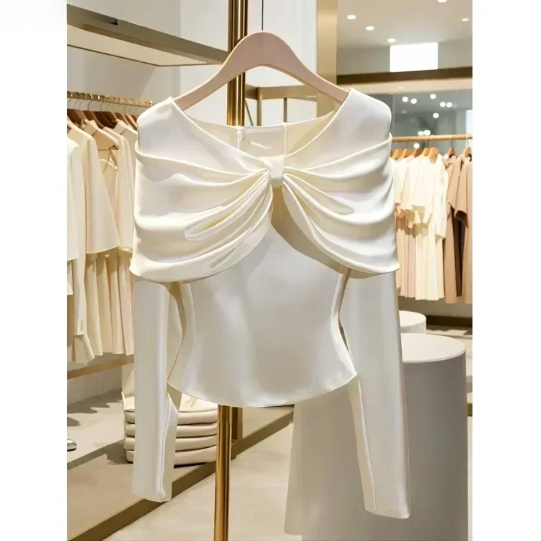 This luxurious blouse drapes like a dream, its satiny fabric catching the light with every movement. A delicate bow graces the neckline, adding a touch of feminine charm to this timeless silhouette.