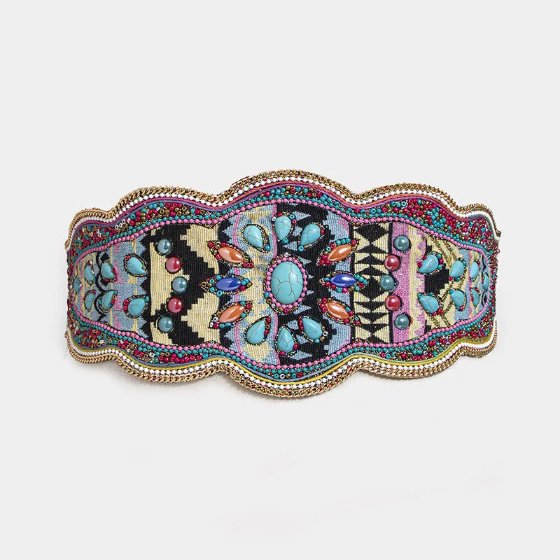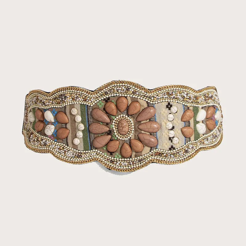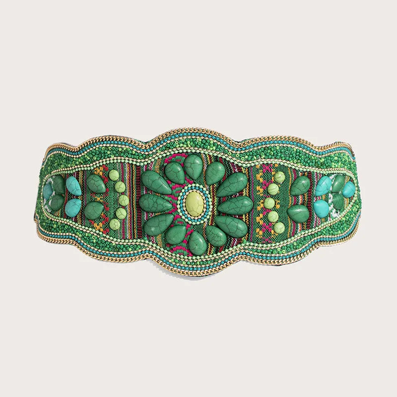 A striking, hand-beaded waist belt showcasing vibrant Bosimia pine stones on an elastic band. The snap buckle secures it with ease, adding a bold, bohemian edge to any look.
